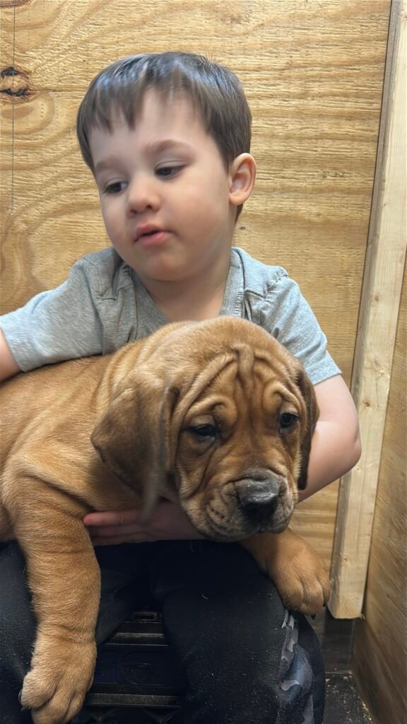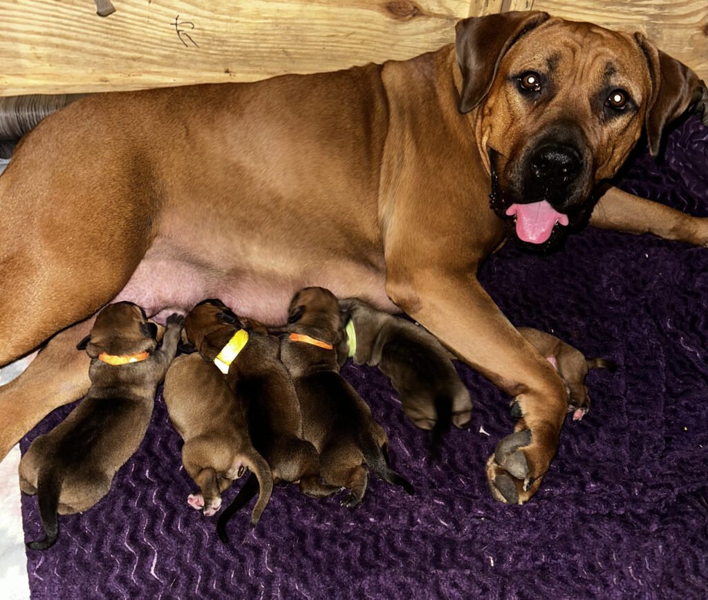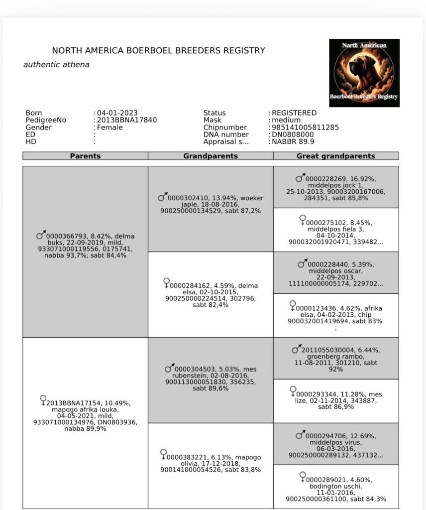 Athena is a registered dam through the North American Boerboel Breeders Registry (NABBR) — one of the most respected pedigree registries for the breed in North America. Her documented lineage reflects a commitment to preserving the true South African Boerboel: a loyal guardian, a stable family dog, and a generational working animal.