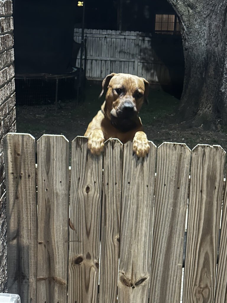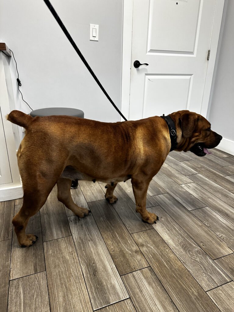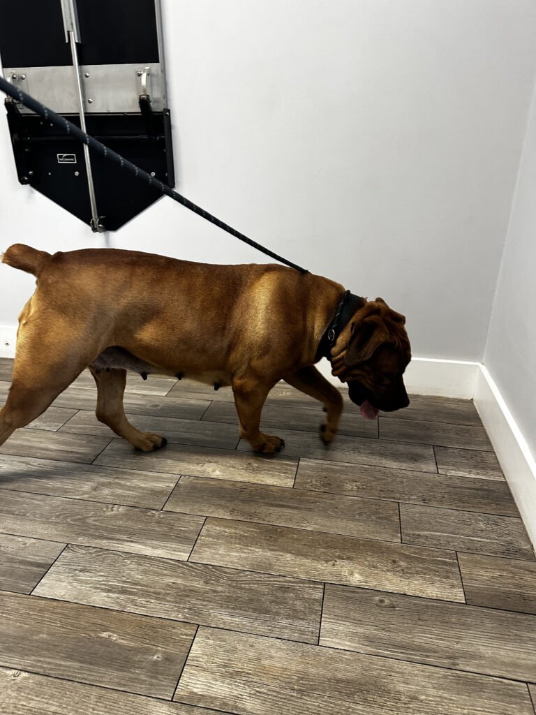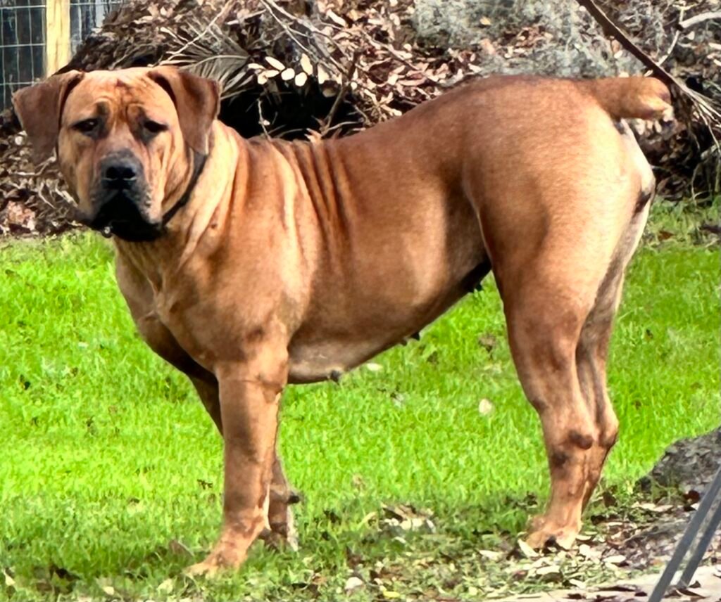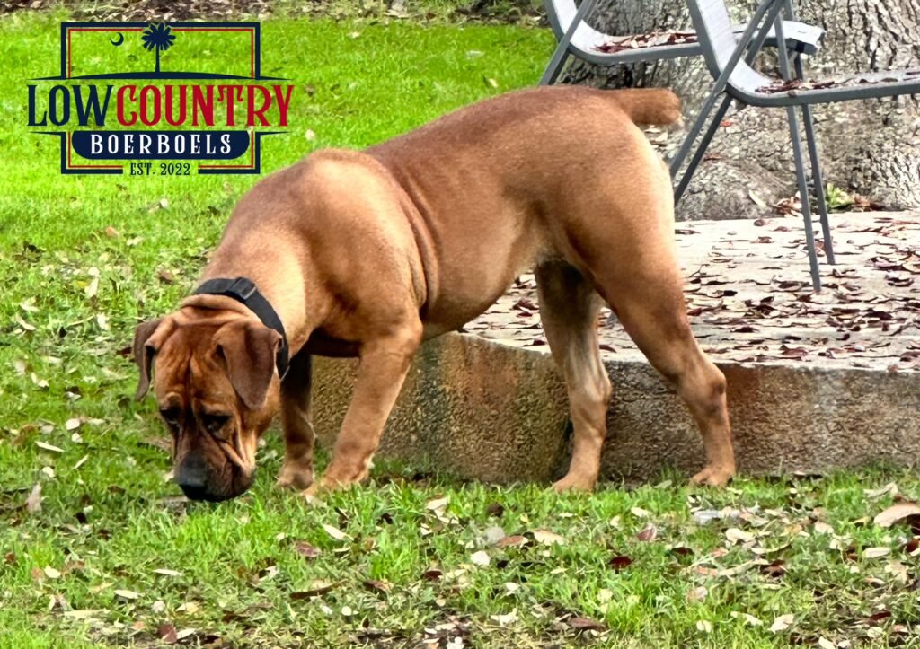 Athena is everything the Boerboel standard demands and then some. She carries a rich, warm tawny-fawn coat that catches the light with a clean, short-haired sheen — no excess, no fuss, just raw breed expression. Her frame is dense and powerfully built, with broad, well-muscled hindquarters that speak to authentic working-dog structure. Her chest is deep, her topline level and strong, and her legs are thick-boned and square beneath her. She moves with the quiet confidence of a dog that knows exactly what she is.